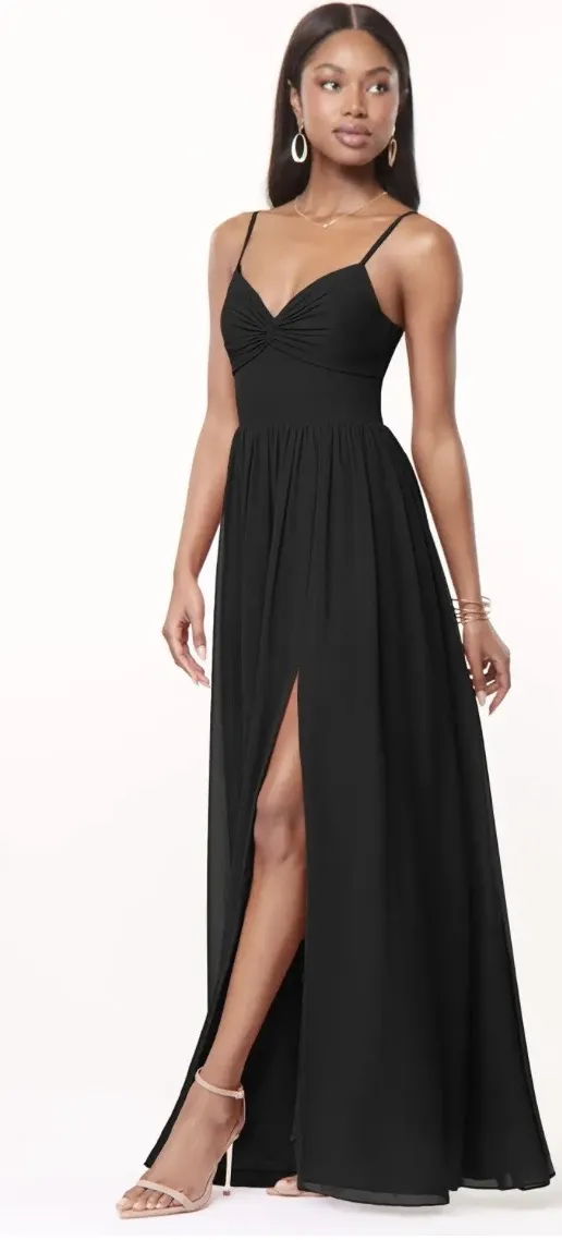 Azazie Zeya Tie Back Split Hem Bridesmaid/Formal Dress in Black size A4 NWT Super cute bridesmaids or formal dress Length : Floor-Length Silhouette : A-Line/Princess, A-Line Sleeves : Sleeveless Neckline : V-Neck Back style : Keyhole, Bow/Tie Back Embellishment : Bow(s), Pleated Features : Leg Slit, Bows, With Pads Padding : Yes Boning : Yes No rips or stains but dress is wrinkled, which can be stream out. Please see photos for approx lay flat measurements