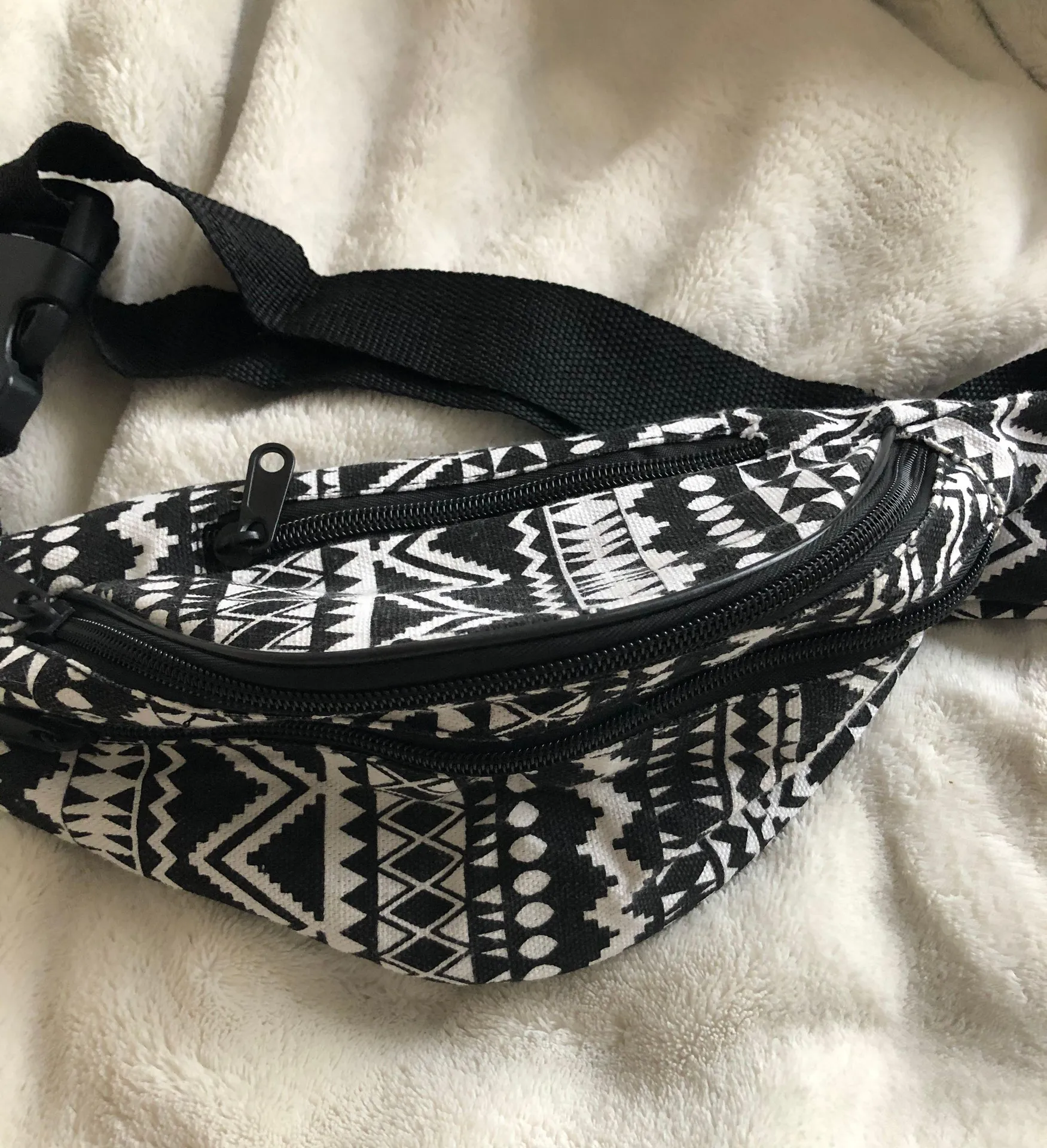 Aztec Print Fanny pack Perfect for summer, Coachella, festivals! Has 3 zippers, a big main one for lots of storage then 2 smaller- one on top and one on the bottom. Lots of space to fit stuff!
