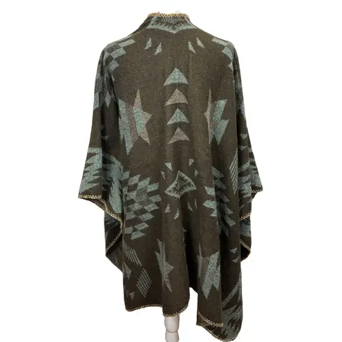 Brand: Unbranded Size: One size fits most Color: Brown, taupe, light turquoise Sleeve length: NA Features: open poncho/wrap/cardigan, geometric aztec pattern, whipstitch trim, relaxed and oversized, earth tones Style: drapey, unstructured, free flowing Occasion: festival, cabin, casual event, relaxing Theme: festival, southwestern, western, boho, bohemian Signs of normal wear. No tags * See photos for clothing measurements and condition. Any flaws or issues with the item will be identified in the description and pictured in the last photos. * Please contact me with any questions. All reasonable offers considered. * Items will be shipped within 1-2 business days. * Free Returns accepted for 30 days after receipt of item. * Thank you for your interest and have a great day!