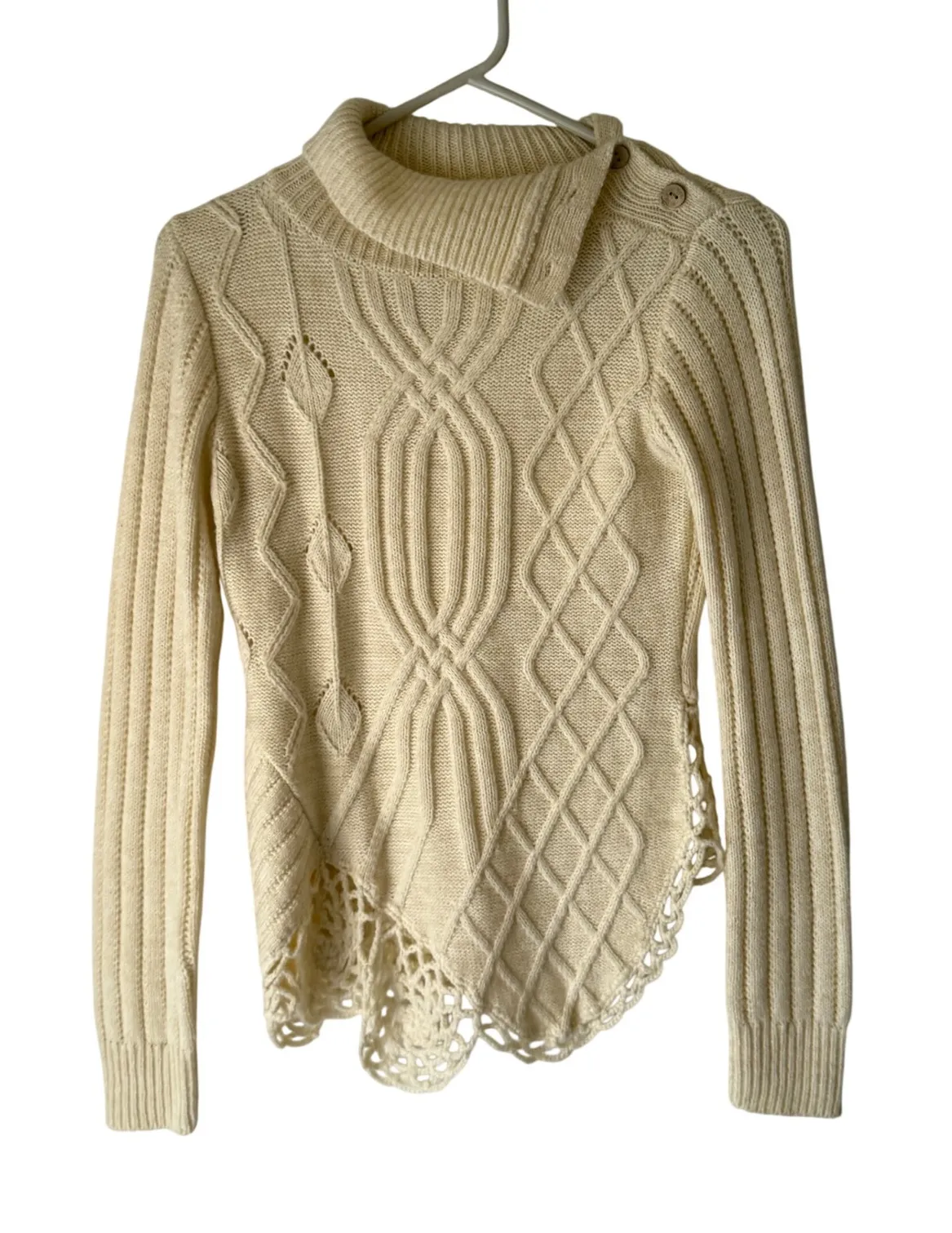 Measurements: • Bust: 15 in • Length: 22 in Style: Pullover Department: Women Material: Acrylic, Nylon, Mohair Neckline: Turtleneck Sleeve Length: Long Sleeve Type: Sweater Features: Open, Stretch Pattern: Geometric Fabric Type: Knit Accents: Button, Crochet Knit Style: Cable-Knit Season: Fall, Winter Fit: Regular Occasion: Casual Keywords: cable knit, turtleneck, crochet hem, asymmetrical, designer sweater, winter fashion, cozy knit, unique design, textured knit, fashion sweater, chic, elegant, statement piece FAQS: We ship out items every 1-2 days due to high volume shipping the mail carrier does not scan the items until it reaches the next facility.This can take up to 48+Hours for tracking to update. We provide measurements in the photos as well as the descriptions. We add as many details as possible until the item is put into inventory. We are unable to take the item out of inventory for additional information. Due to a high volume store we are unable to answer these questions individually.