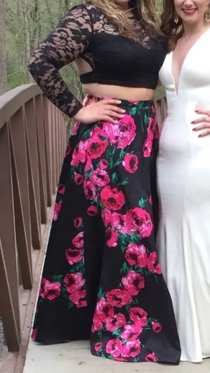 A striking black maxi skirt adorned with vibrant pink roses. This skirt features a high-waist desig... Show more