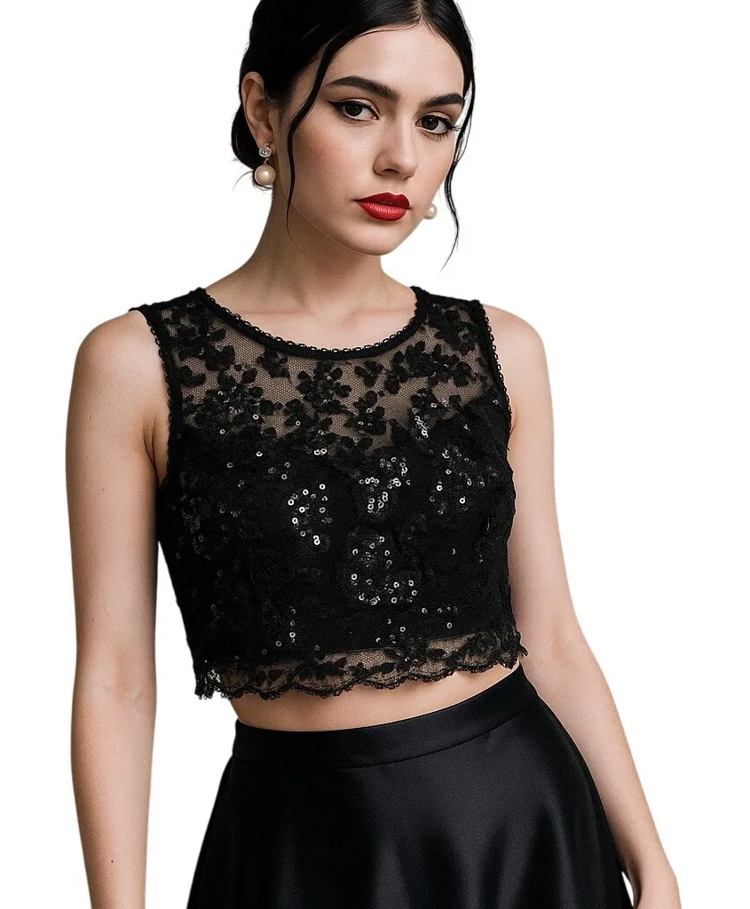 B. Darlin, lace crop top, black sequin top, sheer mesh blouse, gothic glam, evening top, cocktail wear, party top, formal wear, vintage prom, Y2K formal, 2000s glam, lace detailing, coquette gothic, femme fatale, romantic goth, statement top, made in USA, Vampy