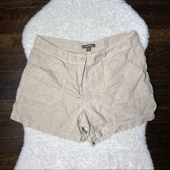 Preowned / used shorts from Tommy Bahama. Khaki / taupe color. Large front pockets. Buttoned bum po... Show more