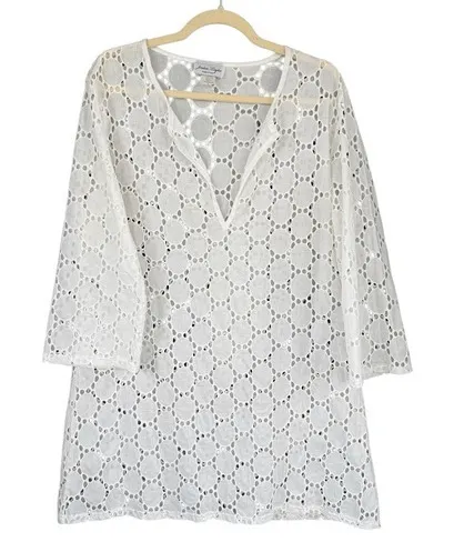 Discover effortless charm with this Jordan Taylor eyelet tunic top. Delicate circular eyelet patterns create a beautiful, airy texture that feels light and breathable against your skin. The intricate detailing and relaxed fit offer a touch of casual elegance perfect for beach days or weekend brunches. Measurements: • Bust: 22 in • Length: 34 in Type: Blouse Department: Women Style: Tunic Material: 100% Cotton Neckline: V-Neck Sleeve Type: Kimono Sleeve Pattern: Geometric Accents: Crochet Theme: Bohemian, Tropical Features: Breathable, Lightweight, Sheer Fit: Relaxed Keywords: Jordan Taylor, eyelet, cotton, tunic, made in usa, white, pullover, embroidered, beach cover up, resort wear, casual, vacation, bohemian, feminine Accepting fair offers! Bundle and save on shipping! Any questions please let me know!