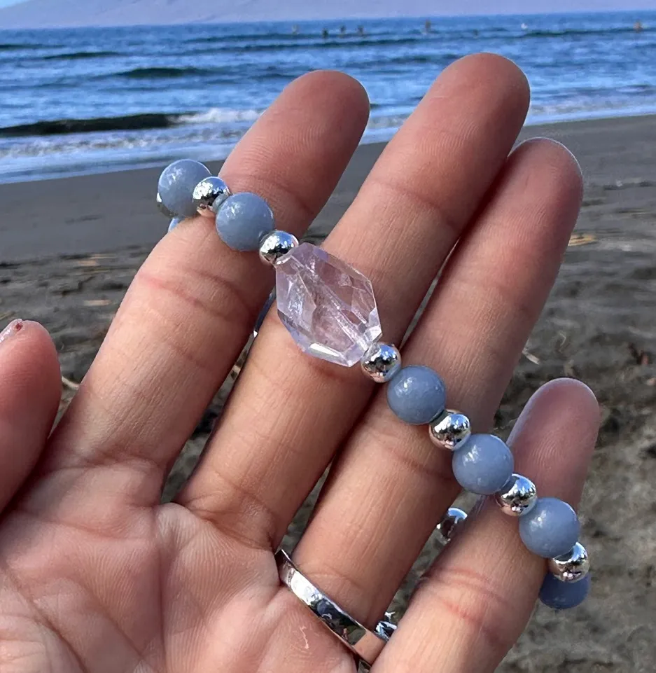 This elegant bracelet features stunning blue beads paired with silver accents, perfect for any occasion. 8mm Angelite & Faceted Lilac Amethyst Nugget w/ .925 Sterling Silver Beaded Bracelet Made in Maui with Aloha Angelite ~ divine love, gentleness, healing AAA Faceted Natural Lilac Purple Amethyst Golden Citrine Nugget Beads Hand Cut Gemstone. Not treated in any way. *one bracelet per purchase.