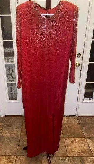 This is a beautiful, red, beaded, long-sleeved gown. It has an open back and a zipper closure, and is 100% silk. It is in pre-owned pristine condition. It would be perfect for a special occasion. Tags were removed