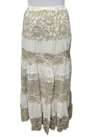 Rare Vintage J.R. Nites by Caliendo Fairy Maxi Skirt This is a beautiful women’s Caliendo flare style lined skirt. The skirt features gold floral inlays and is 100% polyester. The skirt has a elastic band and is a size 8P The skirt is in excellent Preowned condition Tags: Y2K, Bohemian,Floral lace Length 14 inches