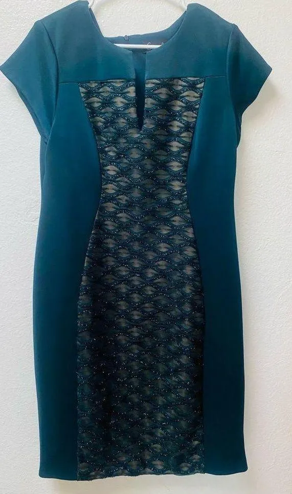 The product is a sheath dress made by Connected Apparel. It has a round neckline and a zipper closure. The dress is knee-length and made of stretch knit fabric with a colorblock pattern in emerald green, maroon, and nude. The dress features cap sleeves and a lace front accent. It is suitable for various occasions such as weddings, parties, and business events. The dress is machine washable and available in size 14 plus.