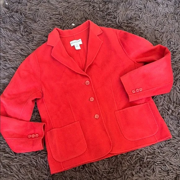Stylish red / orange blazer with button closure and front pockets. Perfect for any occasion. Pendleton Holiday Red Merino Wool Blazer 3-Button Jacket Women’s Size medium Soft and Vern comfy to wear. Not scratchy at all Preowned i Vintage in flawless condition