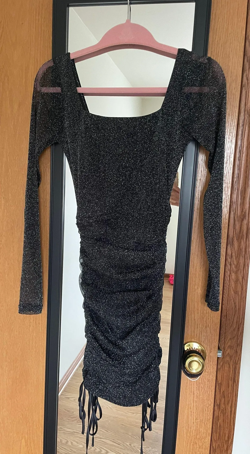 Body con sparkly dress Adjustable ties make dress longer or shorter Size 6 but fits a small as well... Show more