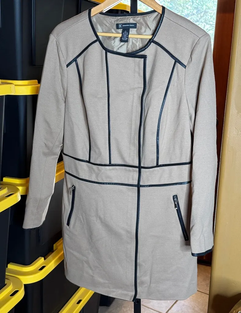 Chic faux-leather trim gives a streamlined finish to this high-style moto jacket from INC International Concepts. Fully Lined: polyester - 60% Rayon/35% Nylon/5% Spandex Hidden asymmetrical front Zipper Closure Collarless Faux-leather trim throughout: polyurethane Hits below hip. Approximate Measurements: Length: 34" Chest: 20 This is in beautiful condition! 3