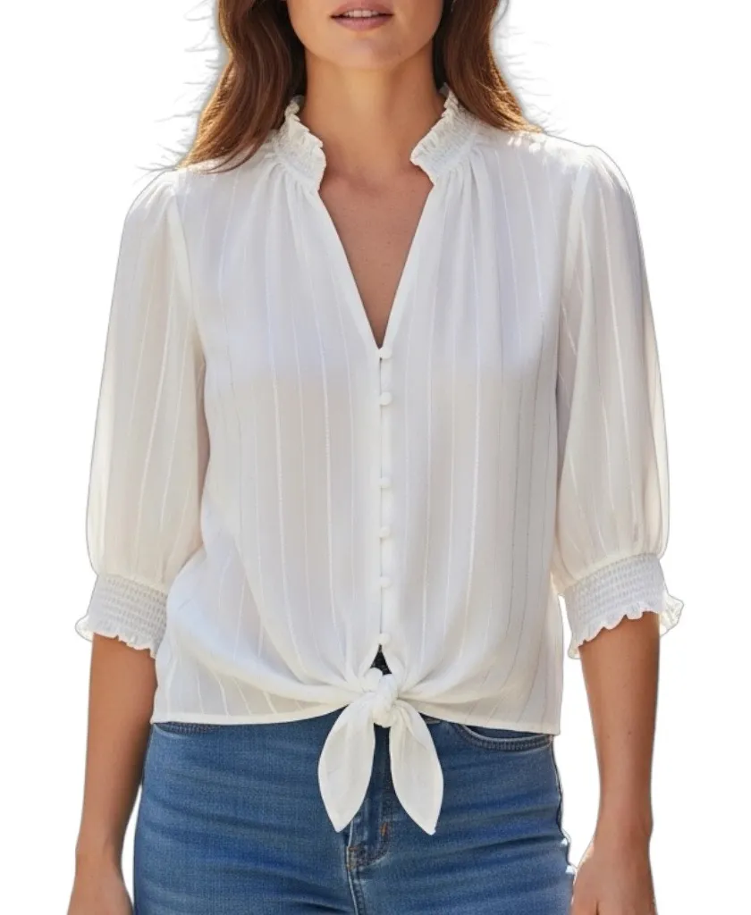 Chic white blouse with button-down front. Features a tie at the waist. Ideal for versatile styling.... Show more