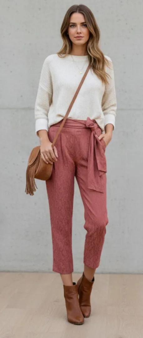 NEW Anthropologie ETT:TWA Rose Mauve Pink Jacquard Aubade Tie Waist Pants Tapered Cropped Size 8 Med... Show more