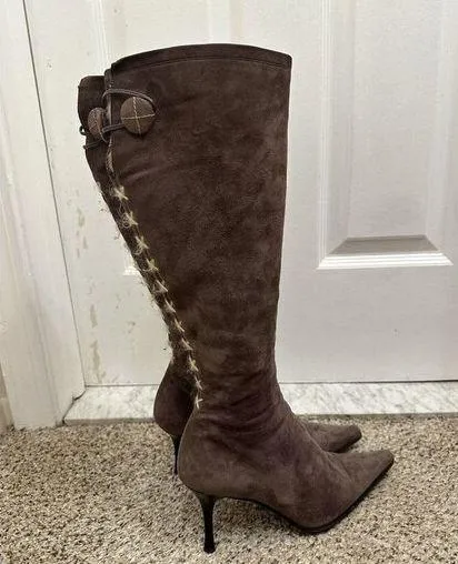 Vicini Tan Suede Faux Fur Lined Knee-High Heel Slip-On Pointed Toe Boots Sz 8 The zipper on one boot needs to be repaired. It is an easy fix. Please see pictures. Designer boots Fall winter boots Side zipper Has some wear on the heels.