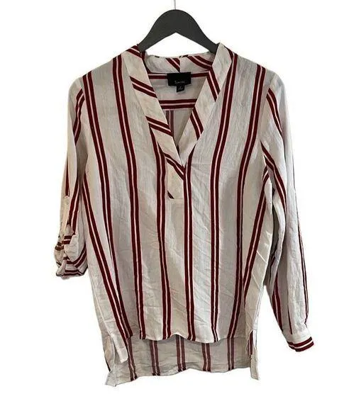 Description: Lumiere Women's Long Sleeve V Neck Blouse Top Vertical Stripe White Red Small. Collared Neckline. Hi Low Hem. Roll Tab Sleeve. Features: Brand: Lumiere Type: Top Style: Blouse, Long Sleeve, Stripes Size: Small Color: Red, White Material: 60% Cotton 40% Nylon Condition: New with tags All measurements are done laying flat and are approximate. Pit to pit 19" Length 27" Thank you for browsing my closet. If you have any questions feel free to message me. 5 star seller ⭐️ Bundle and Save 💰 Smoke free home 🏠 Next day ship 📦