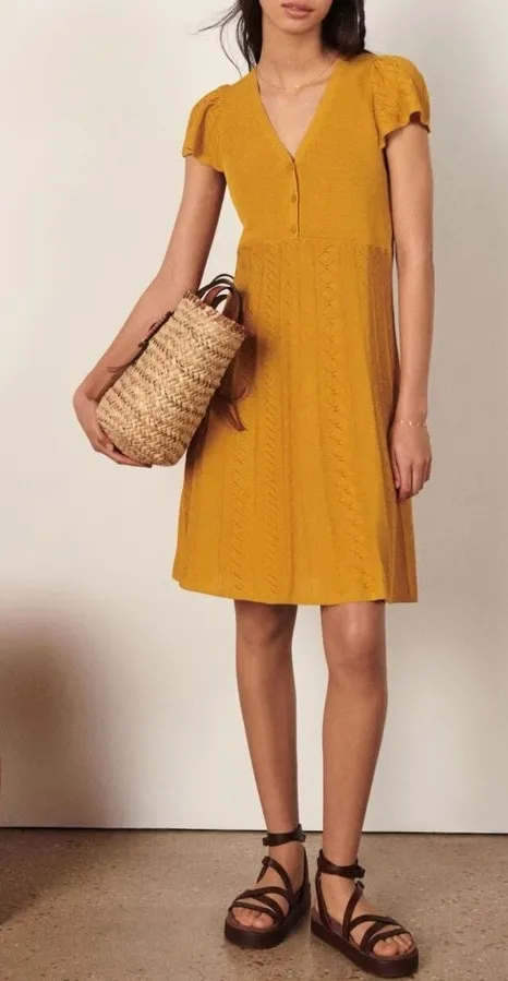 Excellent condition, no flaws Pretty perforated pointelle knitted patterns coer the skirt Three button bodice Fabric tag has been removed but manufacturer cites 63% Viscose/37% Cotton, and the lining is 100% Cotton Sweet cap sleeves Full measurements in photos