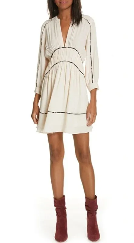 V-neck. Three-quarter sleeves. Ruched banded waist. Contrast piped trims. Pullover style. Skirt portion is lined; the bodice is unlined. Brand Size 1 = US 6 Excellent used condition Retails $295