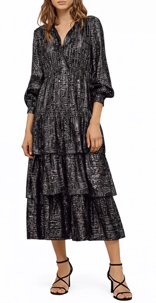 This Ba&sh Sophie dress is a stunning black tiered midi piece crafted from a luxe silk blend with me... Show more