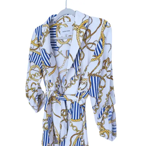 Euro Summer, Boat, Vacation, Sailor, Resort Retail $178 in great condition BABATON is a highly popular and well-regarded brand under the Aritzia umbrella, known for its high-quality, stylish, and sought-after pieces, ensuring strong demand and excellent resale value. Nautical and chain prints are timeless luxury trends that consistently appeal to a broad market, making this cover-up a desirable and quick-selling item. Its versatility as a jacket, robe, or cover-up further enhances its appeal. Perfect as a swimsuit cover-up, a light jacket for summer evenings, for travel, lounging at a resort, or adding a stylish layer to dresses, jeans, or shorts. Robe Jacket, Cover-Up, Kimono, Duster, Wrap Jacket, Belted Jacket. Lightweight Fabric, Smooth, Satin-like (implied), Nautical Print, Chain Print, Stripe Print, Self-Tie Belt, Long Sleeve. White, Blue, Gold, Yellow, Multi-color Print