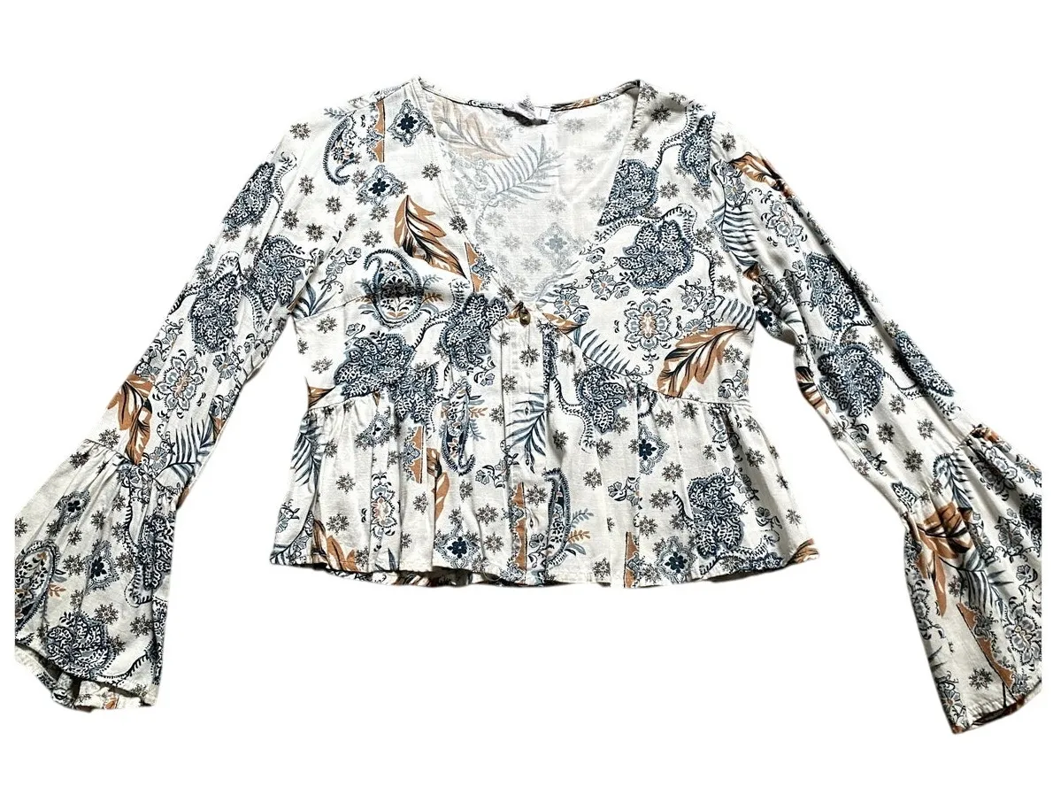 Babydoll Flare Sleeve Crop Floral Paisley Small Blouse Boho Festival Cottage Romantic babydoll crop blouse with a floral paisley print, size Small. Features flared sleeves, a cropped hem, button up details, and a soft lightweight fabric for a flowy boho silhouette. Perfect for festivals, summer layering, or pairing with denim and skirts for a cottagecore-inspired look. Effortless blend of vintage flair and modern femininity. Details: • Style: Babydoll Crop Blouse • Size: Small • Pattern: Floral Paisley • Features: Flare sleeves, cropped fit, flowy lightweight fabric • Style Notes: Boho chic, festival wear, cottagecore, romantic casual outfits • Condition: Gently worn, only flaw is the hook above the buttons is loose, doesn't affect function Keywords: babydoll blouse, floral paisley crop top, flare sleeve boho shirt, festival style blouse, cottagecore crop top, romantic boho blouse, vintage-inspired blouse
