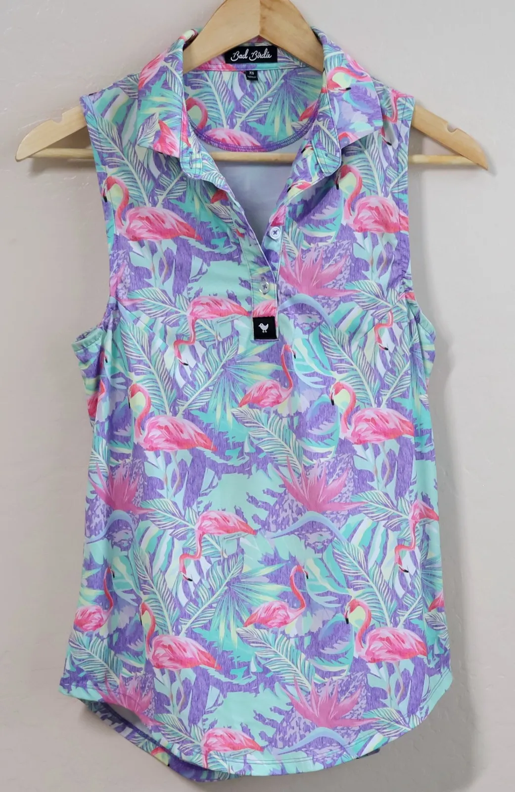 A vibrant statement piece, this Bad Birdie sleeveless polo shirt is bursting with playful personality. The eye-catching flamingo and tropical foliage print sets a fun, summery mood. Crafted for both style and performance, the top features a button-up design and a sporty silhouette that transitions effortlessly from the golf course to casual outings. Enjoy its breathable fabric, designed to keep you comfortable and confident wherever you go. Perfect for a sunny day on the green, a tropical vacation, or a casual brunch with friends. Measurements: • Length: 26 inches • Width (pit to pit): 16.5 inches Keywords: Bad Birdie, Sleeveless Polo, Golf Shirt, Flamingo Print, Athletic Top, Womens Polo, XS Polo, Summer Top, Tropical Print, Golf Apparel, Sportswear, Activewear