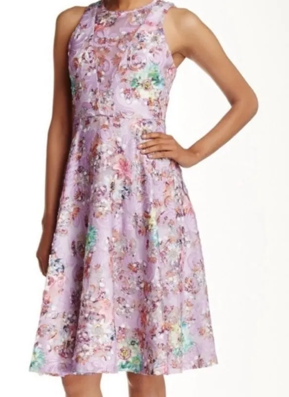 Belle by Badgley Mischka Nadia Dress is perfect for any special occasion. You will get so many compliments! Size: 6 Color: Lilac Multi Unique A-line dress with floral & sequined appliqué shell V-neck plunge with mesh modesty overlay Hidden back zip closure; lined garment Fitted through waist with lightly flared skirt Polyester/Spandex ; Hand Wash Bust flat: 17" Waist flat: 14“ Length 41.5 inches New with tags condition. Mark thru tag to prevent store returns. Item ships quickly and carefully from a non-smoking home.