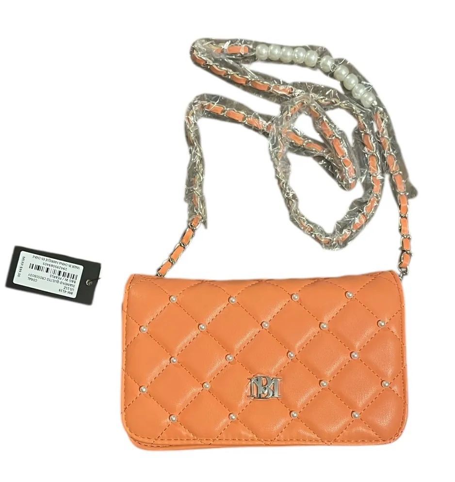Vegan leather coral quilted crossbody bag with faux pearls adorning the strap and front if the bag. Perfect for adding a pop of color to any outfit. Badgley Mischka, NWT $99 retail. 7.5” x 4.5” x 2.25” - 22” strap drop