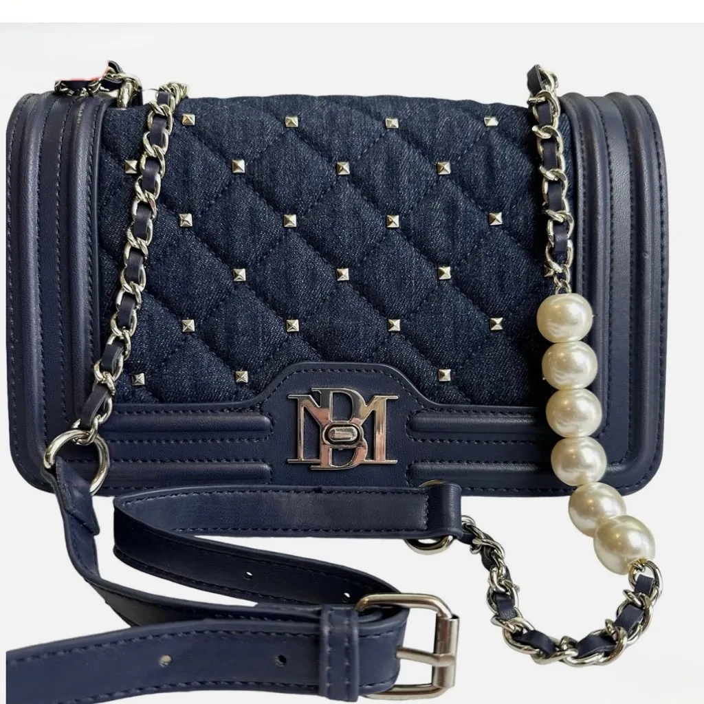 This is a Badgley Mischka Denium Crossbody bag in blue vegan leather with a quilted finish. It featu... Show more