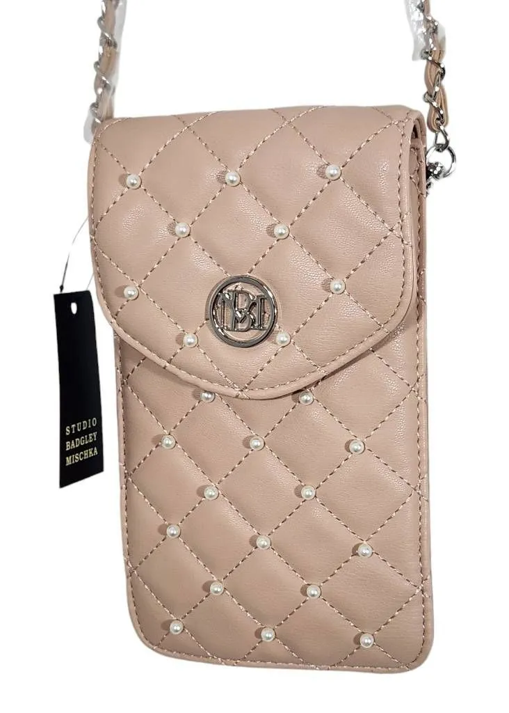 Badgley Mischka phone case with diamond quilting and faux pearls. Crossbody purse features removable strap, snap closure, and cute beads on the strap. Color is nude or ballet pink, called pink on the tag. Vegan leather. New with tags! Measurements shown in images. 1124-CLB5