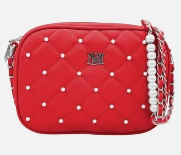 Adorable bag with so many unique details. Bright red shade, quilted texture with pearl accents on front, pocket on back, silver tone hardware, brand logo on front, long strap featuring matching red faux leather woven in a chain and more pearl accents. Nice open space inside, with a zippered pocket and slip pouch. New with tags, still wrapped partially in protective plastic. Approx measurements 8" W X 6" H X 2.5" D