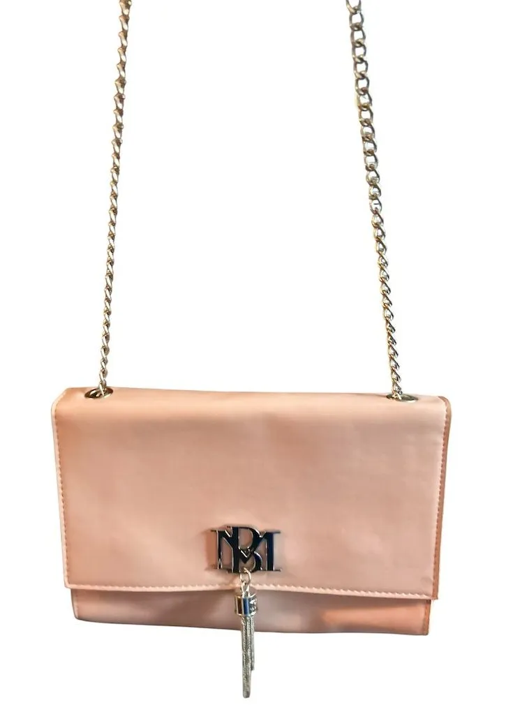 The Badgley Mischka crossbody bag is crafted from vegan leather in a taupe/blush color. It features a metal fringe and a monogram logo, with a chain crossbody strap for easy carrying. Suitable for casual outings or evening events, this bag adds a touch of elegance to any outfit. Pre-owned condition. Keywords: Badgley Mischka, vegan leather, crossbody bag, taupe, blush, metal fringe, monogram logo, chain strap, women's fashion, evening bag, casual bag, pre-owned. Brand: Badgley Mischka Exterior material: Vegan Leather Style: Crossbody Exterior color: Taupe/Blush Department: Women Features: Metal Fringe, Monogram Logo Handle/strap material: Chain Handle style: Crossbody Strap