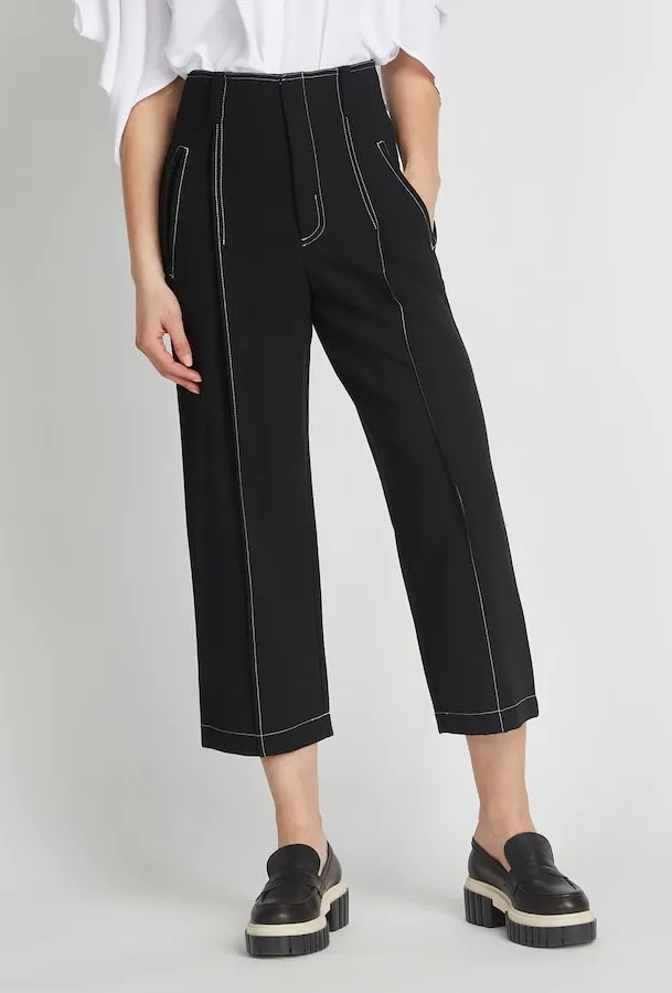 Finish your look in style wearing this wide leg crop pant with contrast stitching designed by Badgley Mischka. • Pintuck at front leg, welt pockets at two sides, contour waistband • Zipper closure, high-rise, beltloops • Fabric: 62% polyester, 33% viscose rayon, 5% spandex • Care: machine wash separately in cold water at gentle setting, use a mild soap or a detergent; do not bleach; tumble dry at low temperature; iron on low temperature; can be dry cleaned Flat lay measurements: Waist 15 Rise 11.5 Inseam 23 Leg opening 8.5