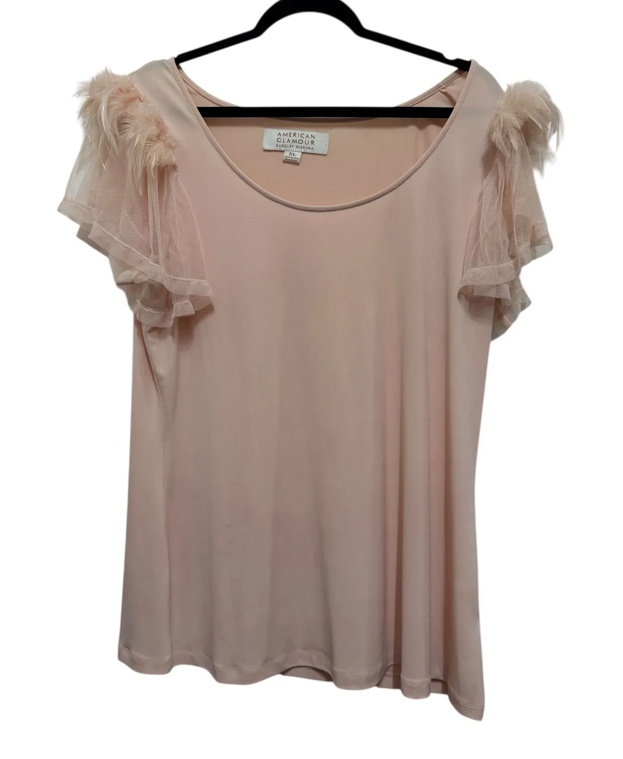 Elevate your wardrobe with this charming American Living top, designed to add a touch of whimsical elegance to any ensemble. Delight in the soft pink hue and the playful texture of the feather and tulle adorned sleeves, offering a unique and eye-catching detail. The scoop neckline provides a flattering and classic silhouette, perfect for pairing with your favorite bottoms. Imagine yourself turning heads at a brunch with friends, enjoying a romantic dinner date, or attending a chic daytime event. Type: Blouse Department: Women Style: Tunic Neckline: Scoop Neck Sleeve Length: Short Sleeve Sleeve Type: Flutter Sleeve Pattern: Solid Accents: Fur Trim, Ruffle Features: Lightweight Fit: Regular Fabric Type: Mesh Occasion: Casual, Party/Cocktail Closure: Pullover Season: Spring, Summer, Fall Keywords: pink top, feather sleeves, tulle sleeves, scoop neck, womenswear, feminine, party top, evening wear, special occasion, unique detail, fashionable, chic