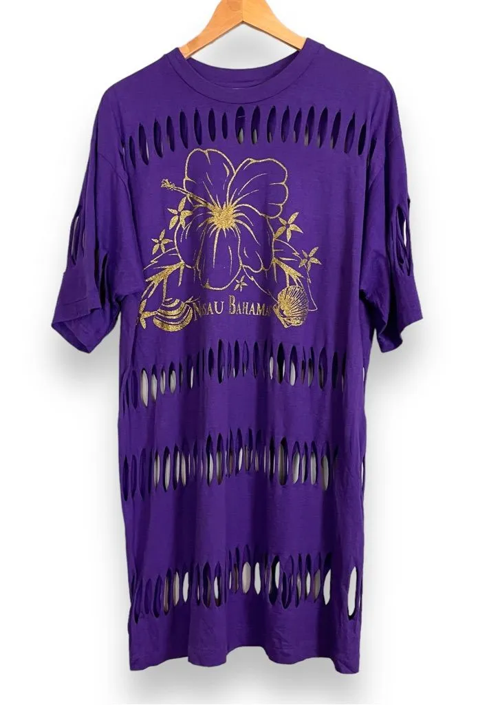 Single-stitch Nassau Bahamas holey bathing suit cover-up t-shirt with gold glitter tropical flower. Unknown if vintage or not. Brand: Arawak | Neely's of Nassau in the Bahamas Condition: Preloved with an unintentional tear in sleeve near the other holes and a small stain on front near the design. White mark inside shirt. Size: Tag reads "XLONG 47." Estimating to fit a modern size large, but see approximate measurements for best fit. Pit to pit: 22" Length: 36" Cleaned and from a smoke-free home. Fast shipper!