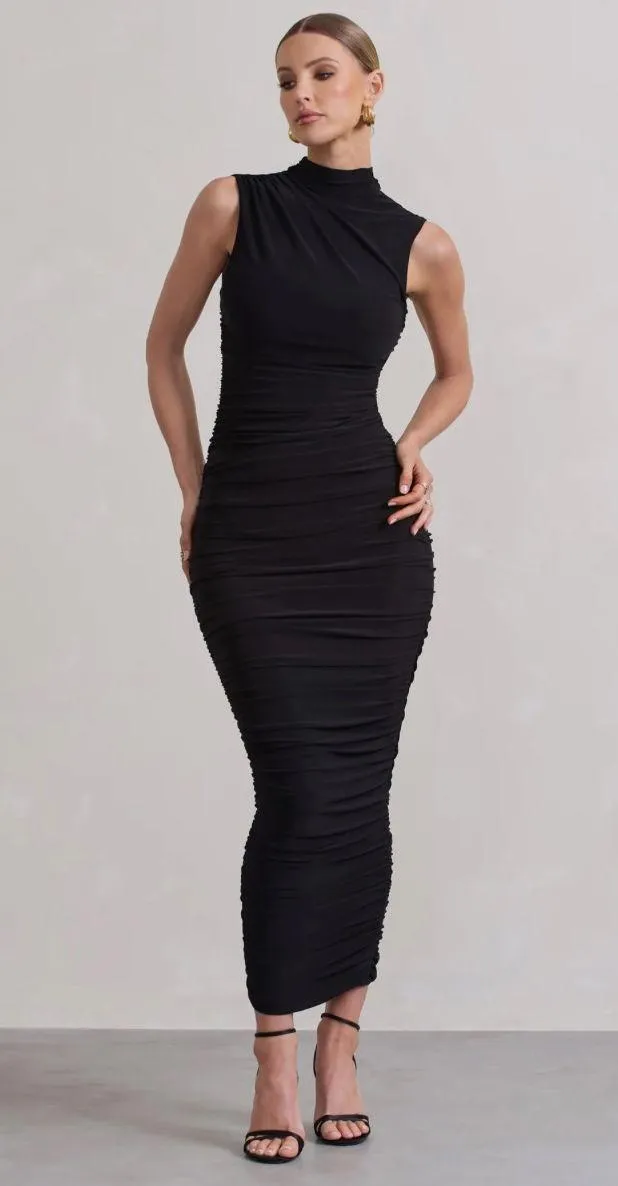 Vintage y2k Whimsgoth Draped Mock Rave Slip Fit Bodice Pencil Shift Sheath Ruched Dress pullover Jersey Bodycon club date coquette high neck Business Black Size M - $89 - From Fuquoa