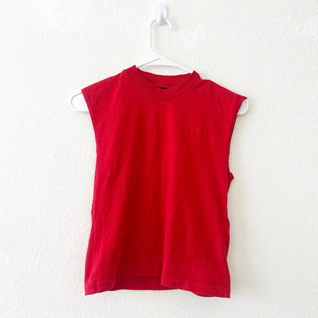 BALENCIAGA embossed shirt and embroidered in the front. This is a kid size 8 but it also fits XS women’s! Fits as a stylish cut tank Also note that this was a T shirt and the sleeves were cut off so note the last two pics.
