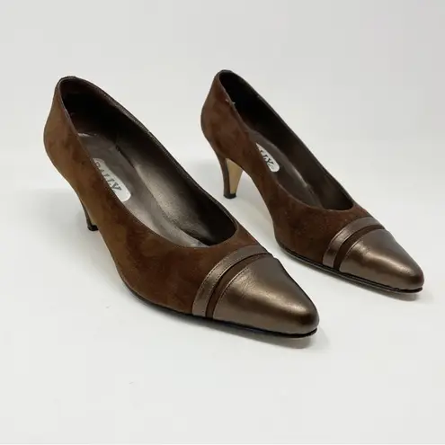 Vintage 90s/2000s Bally of Switzerland Brown suede heels, women’s sz 7. In good pre-owned condition. Butter soft suede in medium warm brown, with a slightly metallic bronze/brown leather accent at the toes. Pointed toes, mid heel. Lightly cushioned insoles, bottoms are leather. There are a few small marks/scuffs on the uppers, bottoms and heels show minor wear. Measures a tiny bit over 9.5” heel to toe inside the shoe, heels are about 2.5” high Smoke free home with pets Bundle 2 or more items and save 20% Classic Y2K office work comfy Euro essential