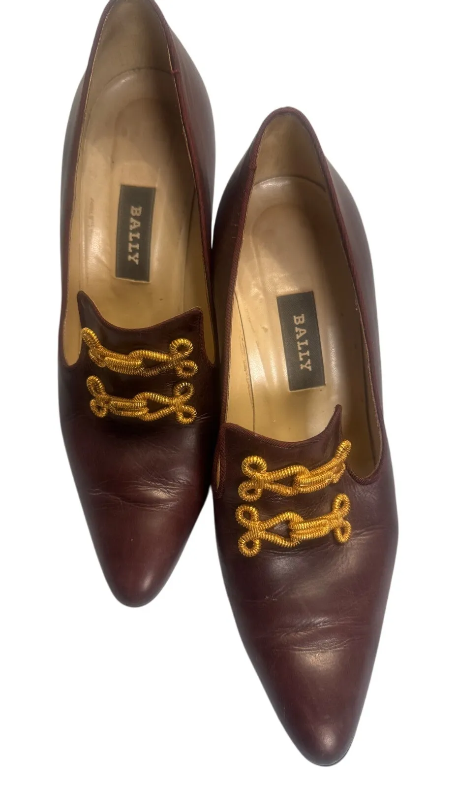Sophisticated vintage heels with a touch of opulence. These elegant shoes feature a rich burgundy leather upper with a sleek pointed toe and a comfortable heel height. The vamp is adorned with a distinctive gold-toned ornament resembling a stylized chain or knot, adding a unique and luxurious detail. Inside, the shoes are lined with a smooth leather, bearing the iconic Bally logo, and they are a testament to Italian craftsmanship. Color: Brown Style: Pump Department: Women Upper Material: Leather Type: Heel Heel Style: Kitten Toe Shape: Pointed Toe Heel Height: Mid (2-2.9 in) Pattern: Solid Closure: Slip On Features: Leather Upper, Gold Ornament, Made In Italy, Pointed Toe, Classic Style Model: Rosa Keywords: Bally, heels, pointed toe, burgundy, leather, gold ornament, vintage, Italian, designer shoes, classic heels, dress shoes, size 7.5, Bally shoes Open to Ofers!