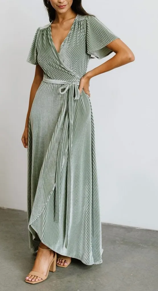 Baltic Born Andi Short Sleeve Ribbed Velvet Wrap Maxi Dress Size: S Color: Dusty Sage Condition: New with tags MEASUREMENTS (approx): Pit to pit 17“, Sleeve length 8“, Length 48/59“ This Baltic Born dress is a gorgeous, flowy statement piece featuring a soft sage green velvet fabric with a ribbed texture. The true wrap silhouette, flutter sleeves, and adjustable waist tie create a flattering, effortless fit that moves beautifully with every step. Its elegant maxi length makes it perfect for weddings, maternity photos, parties, or any special occasion where you want to feel polished and comfortable. Keywords: velvet wrap dress, sage green maxi, ribbed formal dress, flutter sleeve dress, special occasion outfit, wedding guest style, feminine aesthetic, elegant long dress, soft romantic fashion