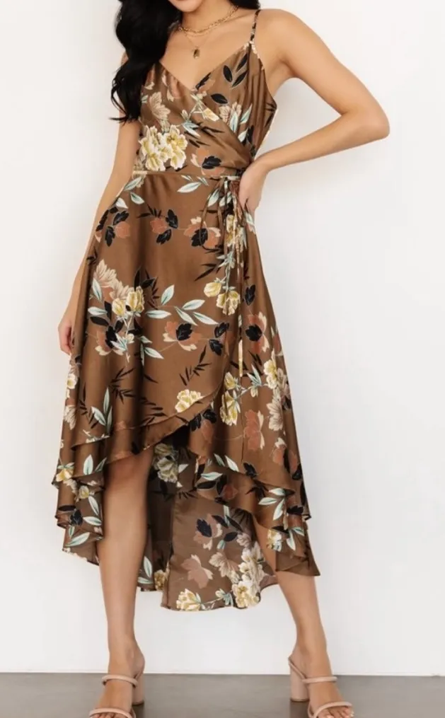 Baltic Born Brown Steffi Tulip Wrap Satin Dress Mocha Floral NWT Large - $45 New With Tags - From Christie