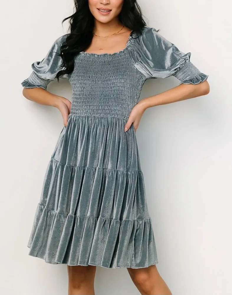 New With Tags Condition • Crushed Velvet • Soft and Stretchy • Maternity • Flowy • Midi • Tiered • Smock • Boho • Cottagecore 93% Polyester 7% Spandex Lining 100% Polyester Measurements Laying Flat Bust: 13.5" Waist: 12" Shoulder to Hem: 37" * I Ship Next Day, please ask any questions and I will get back to you quickly Item #160