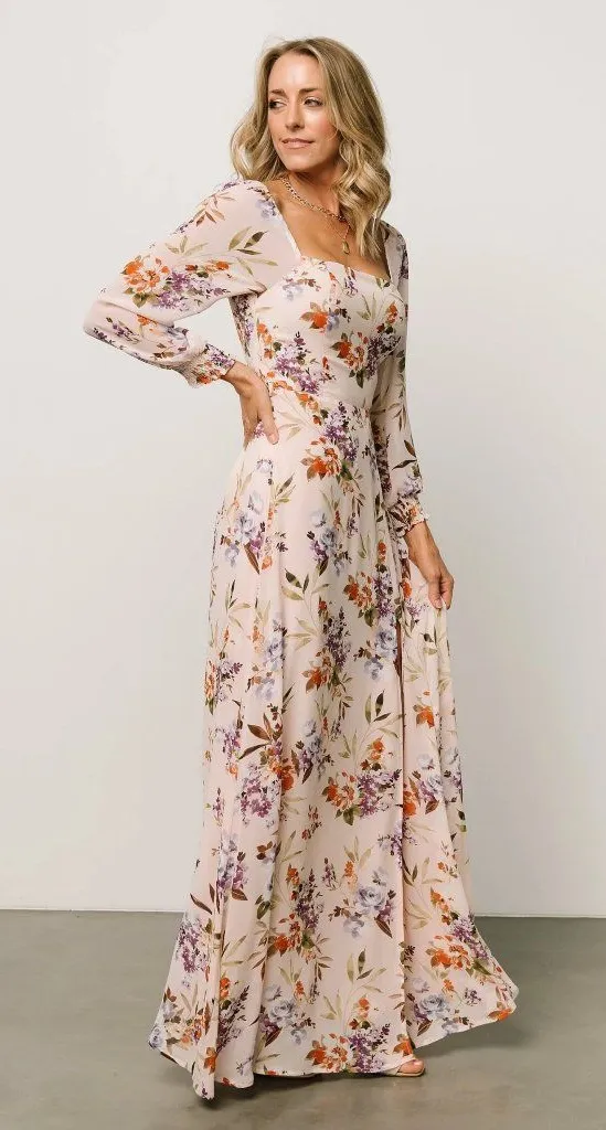 Baltic Born Giselle Smocked Maxi Dress in Blush Pink Floral; brand new without tags High-quality chiffon material Smocked back bodice Longer 3/4 length sleeves Airy sleeves with smocked cuffs Slit at front left up to mid-thigh Fully lined excluding sleeves Brand tag cut out to prevent customer returns No size tag but measurements point to a size XS Approximate measurements: Chest: 33" Length: 59" Tags: bridesmaid, floral, elegant, wedding guest, pastel, spring, summer, cocktail, party, brunch wear, mother of the bride, mother of the groom, boho