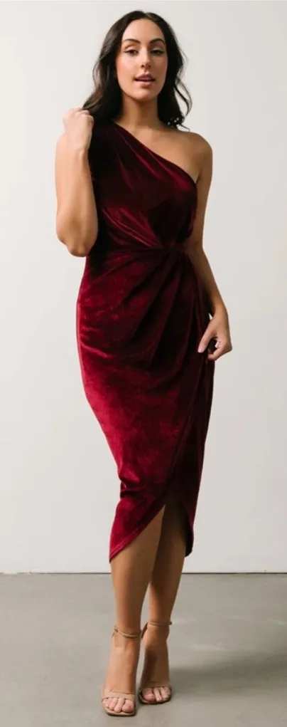Baltic Born Kourtney Velvet Dress One Shoulder Tulip Hem Burgundy Merlot Red Womens size Small Condition: Very good- gently worn-no flaws noted Details: -Closure: Side Zipper -Velvet -One Shoulder -Tulip Skirt -Fitted Bodice -Pleated Detail Waist -Lined -Stretchy Dimensions: Length: 51 1/2” shoulder to back hem Waist laying flat: 26” stretches to 30” Bust laying flat: 34” stretches to 36” Keywords: red velvet cocktail dress elegant soft luxe one shoulder timeless formal evening semiformal gala event wedding guest cocktail party tulip skirt eveningwear special event special occasion polished sophisticated sexy curve hugging silhouette figure hugging silhouette comfortable stretchy burgundy red velvet bridesmaid dress fall bridesmaids baltic born kourtney dress velvety fall favorite autumn winter wintery maroon ruby red jewel toned