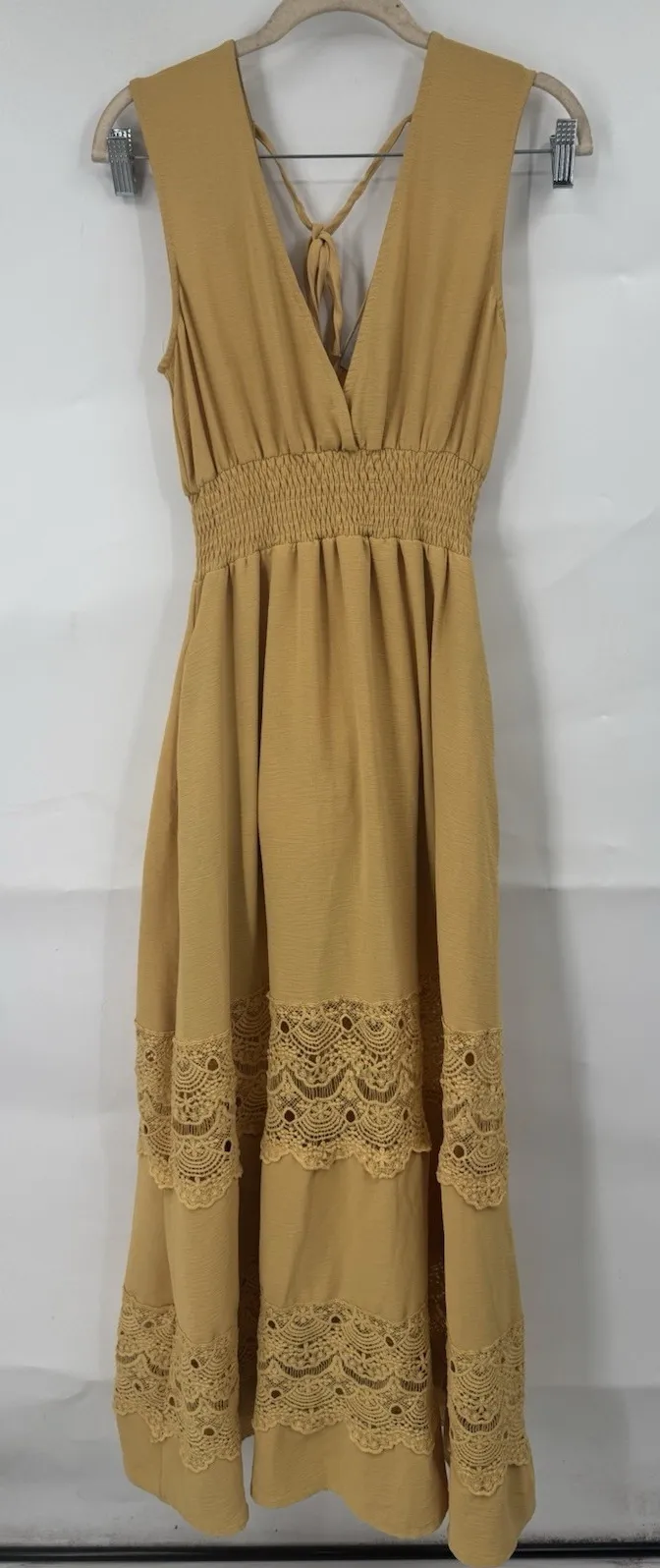 Great pre owned condition. Has tie in the back at the neck. Has pockets. Tiered. Size small. All measurements are approximate: 16 inches pit to pit. 28 inch waist. 60 inch length from shoulder to bottom hem. GG14