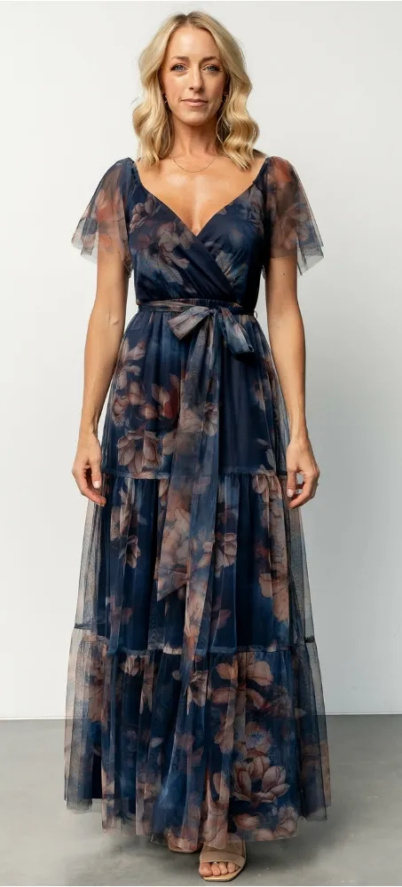 brand new no tags size XL p2p 20' length 60' Beautiful and feminine dress for any special occasion Gorgeous floral design on a deep blue background High-quality tulle material over lining that flows beautifully Crossover surplice neckline with elastic shoulders Short sheer sleeves with extra layer of tulle Smocked back bodice with elastic at back waist Removable self-tie at waist Pull-over style Tiered maxi length skirt Fully lined, excludes sleeves Extra layer of tulle Raw hem Nursing friendly *missing waist tie *item is new from manufacturer but detagged to prevent returns BB68 ZIP