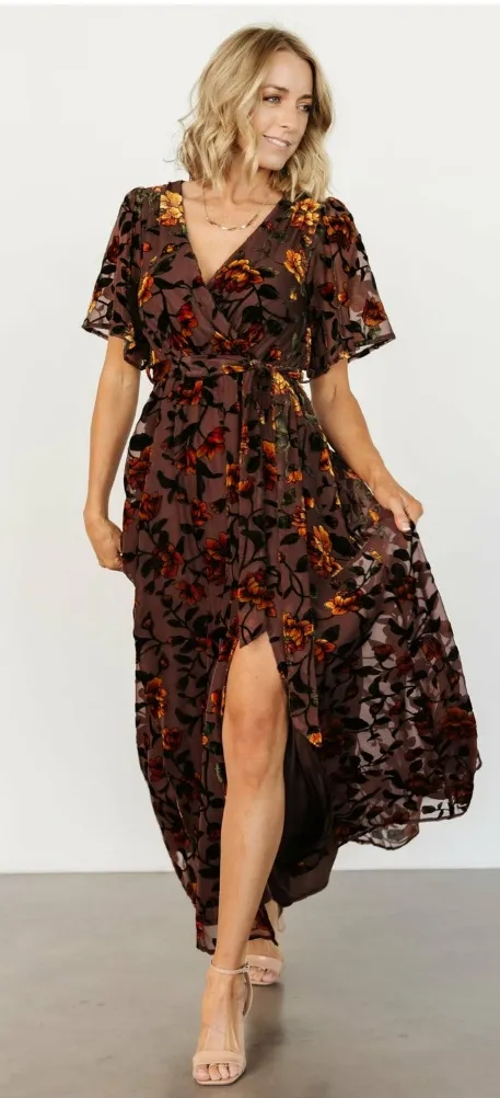 brand new no tags size XL p2p 20' length 59' Velvet material with a burnout mesh floral print Crossover surplice neckline Flowy short sleeves Elastic waistband with detached self-tie sash Maxi skirt with leg slit *missing belt *item is new from manufacturer but detagged to prevent returns BB66