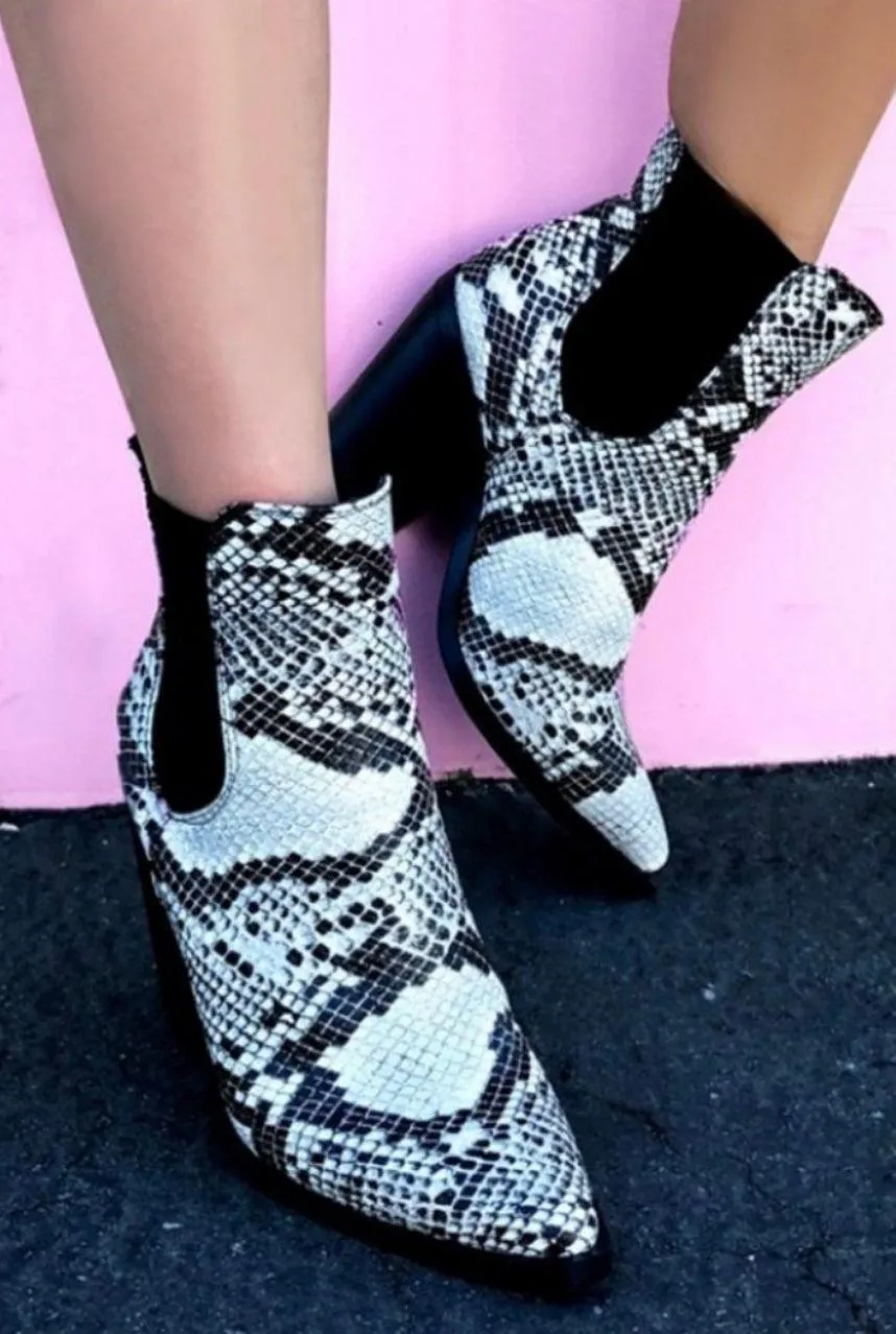 Jump start the Fall season with these snake print Heeled Bootie! Made with Love to fit true to size... Show more