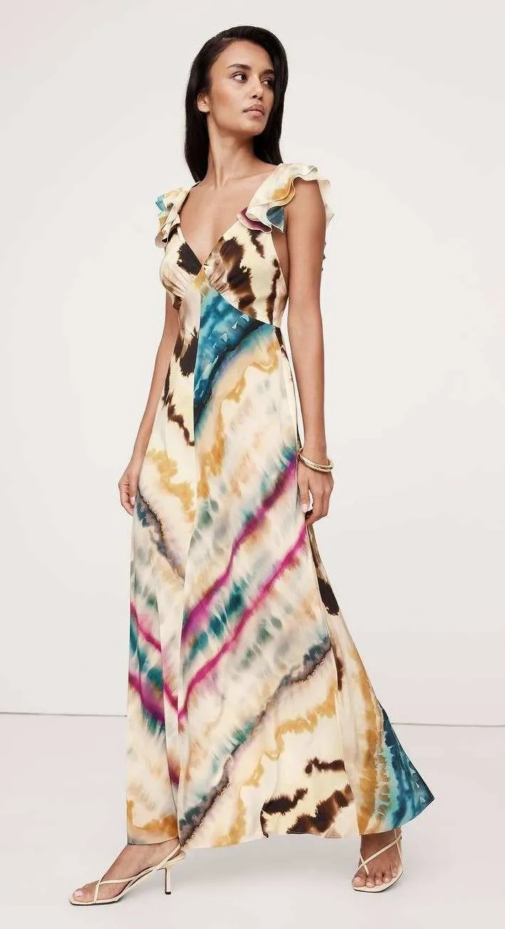 Keywords: maxi dress, tie dye, ruffle, v neck, flowy, resortwear, vacation dress, summer dress, bohemian, ethnic print, open back, elegant, beach dress, wedding guest, spring, lightweight, silk, elegant, classic, formal