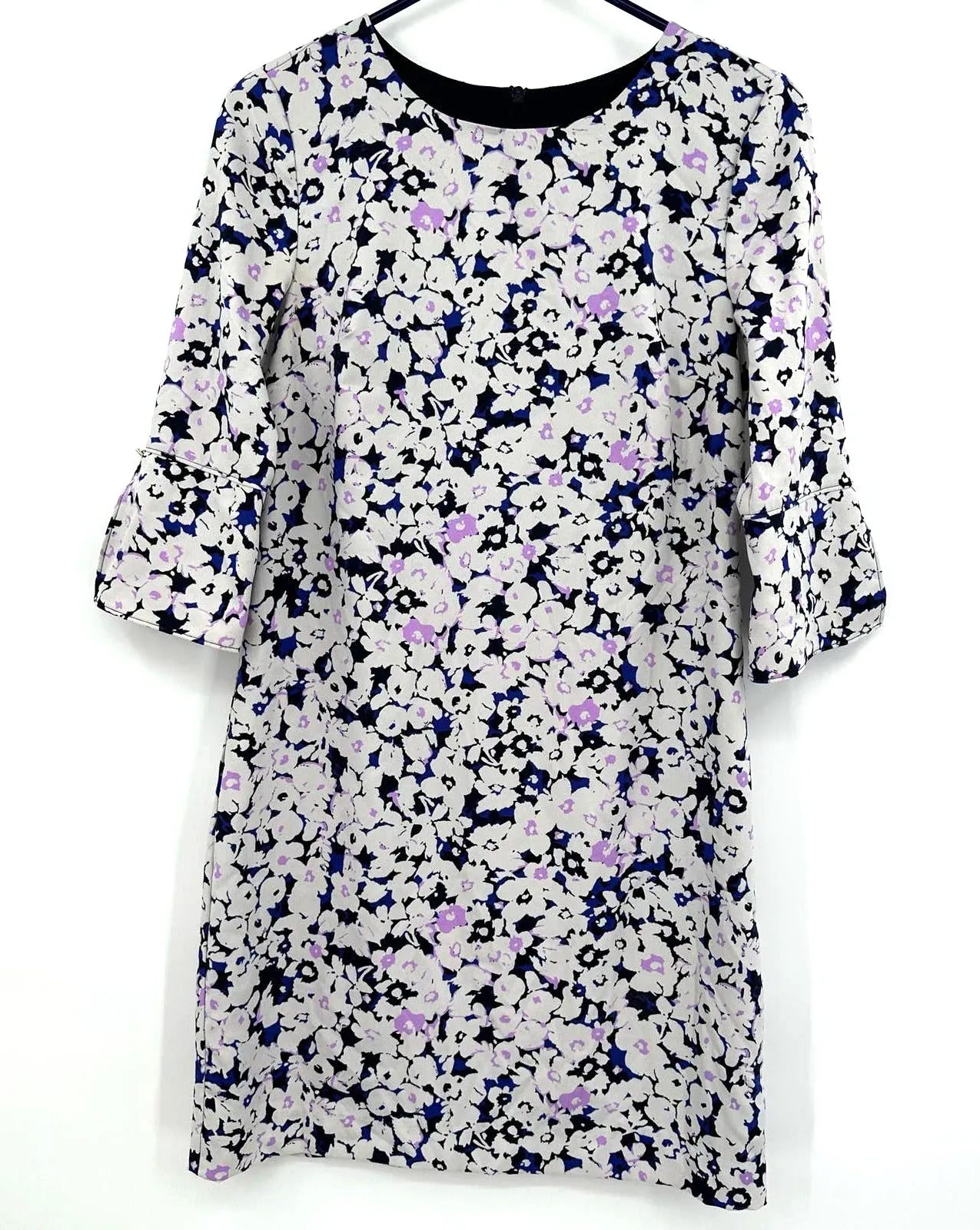 Banana Republic size 0 mini dress longer bell style sleeves hidden rear zip floral white purple