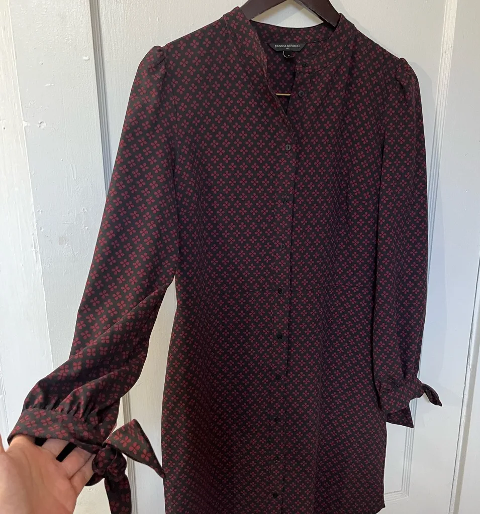 Chic long sleeve dress with a black and red pattern. Features a button-up front and stylish bow cuff... Show more